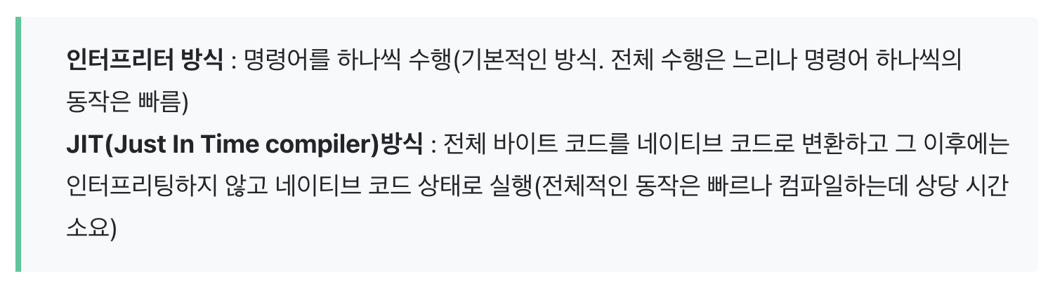 - Excution Engine 은 Class Loader에 의해 메모리에 적재된 클래스(바이트 코드)들을 기계어로 변경해 명령어 단위(Operation Code)로 실행하는 것을 말한다. 명령어 단위 실행에는 2가지 방식이 있다.