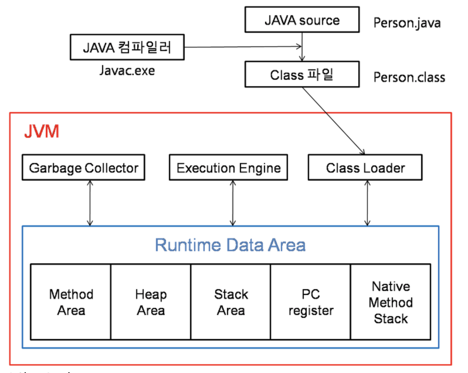 - 예를들어 자바에서 코딩시 a.java 파일이 생성된다고 하면 .java 소스를 자바컴파일러(javac)가 컴파일 하여 a.class 같은 클래스 파일(바이트코드)로 변환해준다. Class Loader 는 이러한 class 파일들을 모아서 JVM이 운영체로 부터 할당받은 메모리 영역인 Runtime Data Area로 적재하는 역할을 한다.
