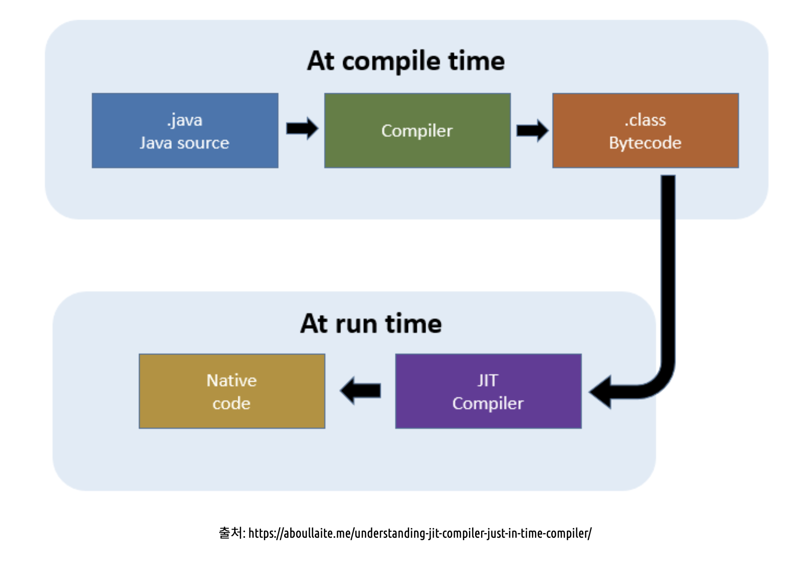 JIT 컴파일러는 런타임 시 클래스파일(바이트코드)를 네이티브 기계어로 한방에 컴파일 후 사용하는 개념으로 이해하는 것이 편한다.