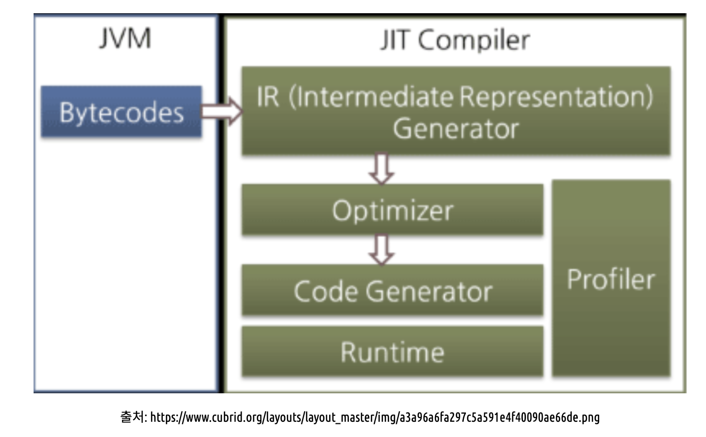 JIT 컴파일러는 Just In Time 컴파일러로 바이트 코드를 기계어로 번역하여 실행하는 것을 뜻한다.