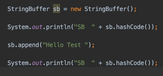 이번은 String Builder 객체가 작동하는 방식을 보여주고 있다. 기존의 문자열에 새로운 문자열이 추가되는 모습을 보여주고 있습니다. 새로운 객체가 생성되거나 가비지 컬렉터의 대상이 되는 객체가 발생하지 않음을 알 수 있습니다. 단, toString() 메소드를 실행하는 경우 새로운 문자열 객체가 생성될 수 있습니다.