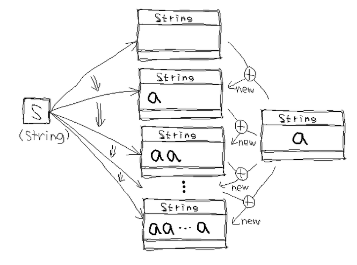 또한 수십번 String 이 더해지는 경우에는 String 의 주소값이 Stack 에 쌓이고 클래스들은 Garbage Collector 가 호출되기 전까지 heap 메모리에 지속적으로 쌓이게 된다. 메모리 관리적인 측면에서는 치명적이라고 볼 수 있다.