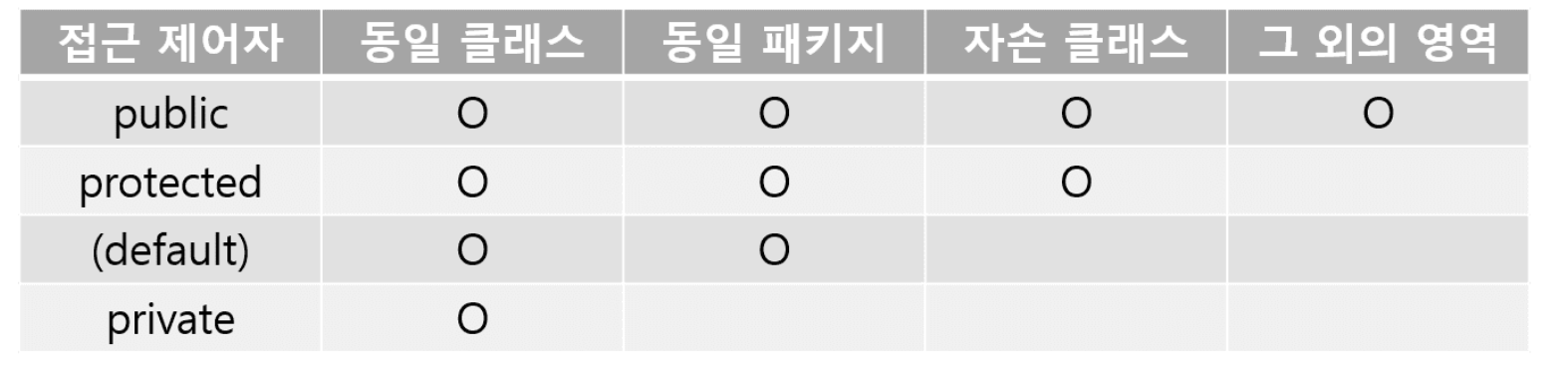 - 접근 제어자 - 접근 제어자는 해당 클래스 또는 멤버를 정해진 범위에서만 접근할 수 있도록 통제하는 역할을 한다. 클래스는 public 과 default 밖에 쓸 수 없다.