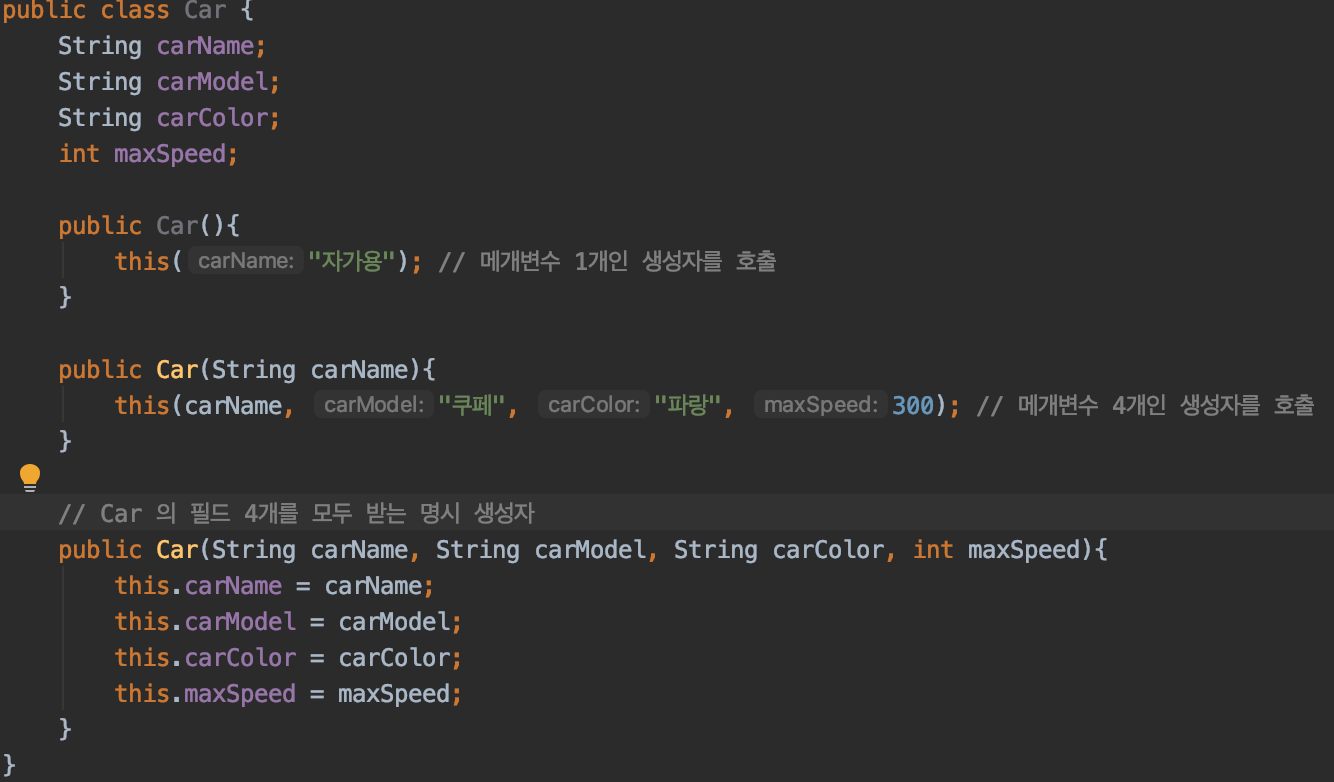 또한 생성자에서는 this() 를 사용할 수 있는데 이는 또 다른 명시적 생성자에 접근하는 방식이다.