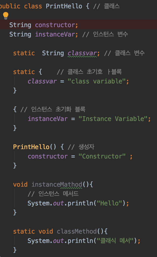 - 초기화 블록 ( Initializer ) - 초기화 블록 내에서는 조건문, 반복문 등을 사용해 명시적 초기화에선 불가능한 초기화를 수행할 수 있다.
