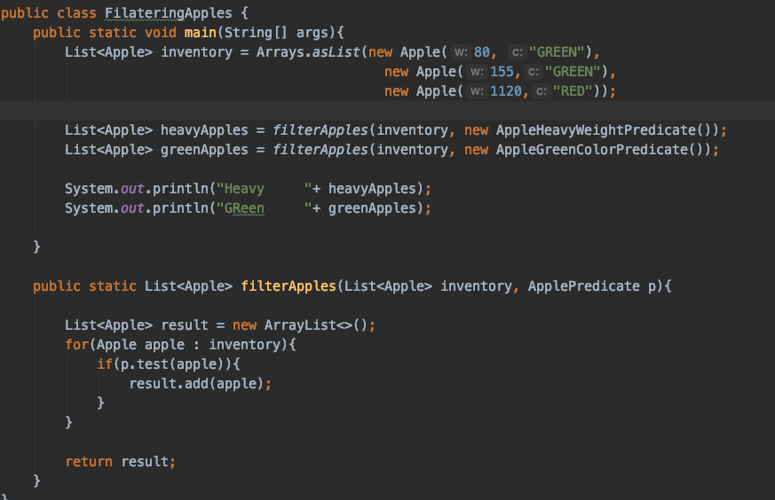 동작 파라미터를 이용하면 자주 바뀌는 요구 사항에 효과적으로 대응할 수 있다. 동작 파라미터화란 아직은 어떻게 실행할 것인지 결정하지 않은 코드 블록을 의미한다. 동작 파라미터화란 아직은 어떻게 실행할 것인지 결정하지 않은 코드 블록을 의미한다. 예를 들어 나중에 실행될 메서드의 인수로 코드 블록을 전달할 수 있다. 결과적으로 코드 블록에 따라 메서드의 동작이 파라미터화된다. 예를 들어 컬렉션을 처리할 때 다음과 같은 메서드를 구현하고자 가정하자.
