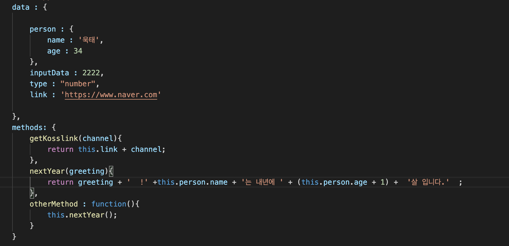 먼저 메소드를 선언하자 nextYear 에 보면 this.data.person.name 이라고 안한 이유는 vue 에서는 this.person으로 사용할 수 있도록 자동으로 찾아준다고 한다. (참고해서 보는 유투브 설명이 그랬음)